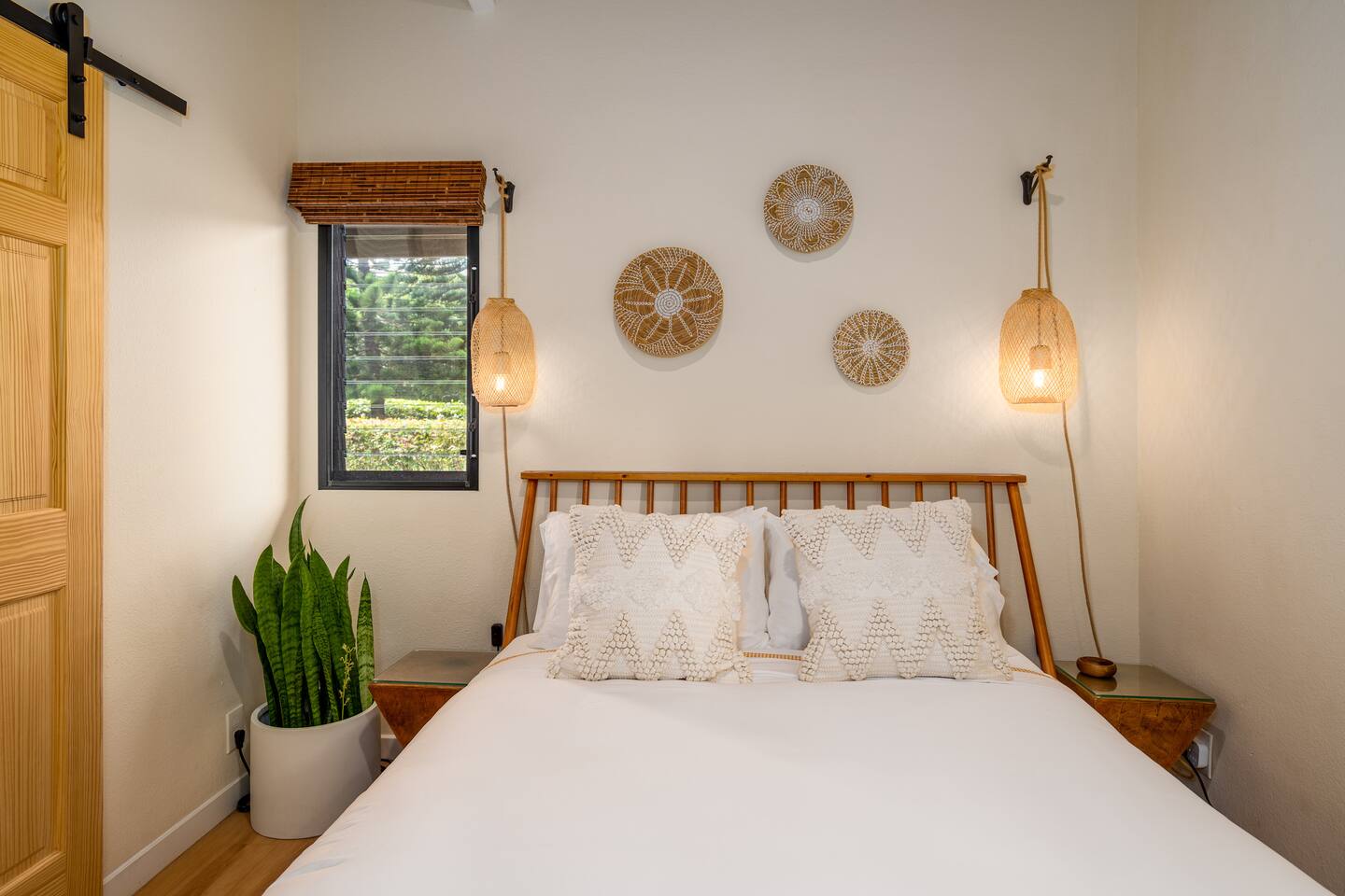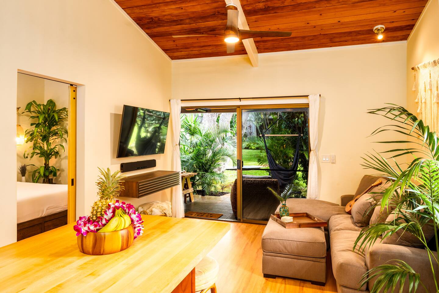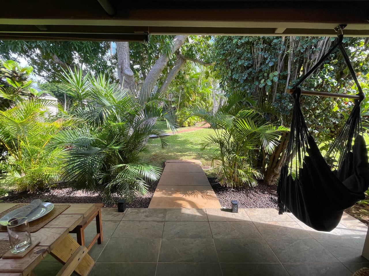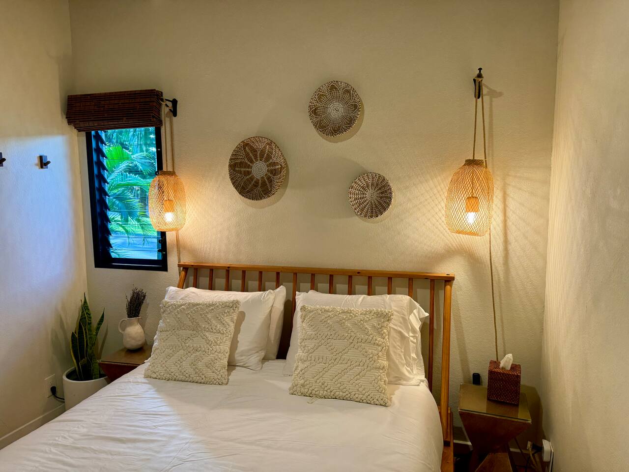 Wake up to the sounds of the palms dancing in the wind, tropical birds singing and waves crashing. Enjoy your complimentary morning coffee or tea with the ocean breeze, monarch butterflies and sea turtles. All with stunning views of neighboring islands Moloka‘i and Lanai just steps from your front door. During fruit season, pick your own breakfast from the mango tree right off of your private lanai, or enjoy many of the other tropical fruits the fruit plantation has to offer. Walk to 2 local beaches and several restaurants. Take in the rainbows over the gardens and ocean. Experience the warm trade winds, sandy surf, breathtaking views and glittery stars at night. In the winter months watch whales and dolphins play from the oceanfront lounge. _______________________ Our love shack was designed to bring complete relaxation and bohemian aloha vibes for the dreamy vacation you deserve. As you arrive to the property, you’ll have reserved 1 car parking right next to the house, perfectly situated underneath the apple banana trees for a tropical welcome! Upon entering you'll find soaring high ceilings throughout the property. The great room is perfect for entertaining with a fully equipped kitchen, island seating and open layout that flows to the oversized cloud-style couch. Pair your phone or laptop to the sound bar and enjoy music all day. We also have a 55” 4k HD Smart TV equipped with complimentary Netflix and cable, perfect for enjoying a movie after a long day at the beach. Seamless indoor/outdoor living— the great room opens up to the sunny and private lanai covered in lush tropical landscaping. Features include a large dining table, guest amenities closet, towel hooks, lounge chair as well as a swinging hammock chair. The perfect sanctuary to read, meditate, entertain, dine, catch up on some work or do some yoga. The main bedroom provides a king sized nectar memory foam mattress, situated under an oversized mandala headboard hand carved in Thailand. Lush jungle views from both windows, handmade furniture, and plenty of closet space. The second bedroom features a queen tempur-pedic. Peek-a-boo ocean views and the perfect desk space to work from home in style with views of the banana trees. The bathroom features a private shower finished with grounding stone and an oversized, therapeutic rainfall shower head and wand. You can also find storage in the vanity as well as a washer and dryer in bathroom closet. We provide all of these extra touches to make your stay as comfortable as possible: - We only provide organic sensitive skin products (EO & Puracy only!) - Free Wifi - Black out bamboo shades in every bedroom - A/C in each room - Smart G home assistant in the kitchen - Fruit picker - 2 surf boards - 2 boogie boards - 4 beach chairs - Cooler bag - Beach umbrella - 2 tennis rackets & balls - 1 basketball - Ukulele - 3 luggage racks - Cooling bamboo comforters - Extra sheets - Extra beach towels - Extra bath towels - Steamer - Q tips - Makeup remover wipes - Local fruit - Hawaiian coffee - Yogi Tea - Emergency flashlight, lanterns & extra batteries - Basic cleaning necessities - USB ports next to every night stand - Light dimmers in bedrooms, living room & kitchen - Mid stay cleaning available upon request for additional fee _______________________ We would be very happy if you leave us a review after your stay. It helps us provide the best guest experience possible, especially if you describe how you spent your time and what you explored in the area :) _______________________ *All photos taken on or a short distance from the bungalow*