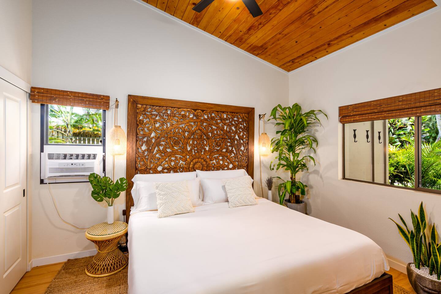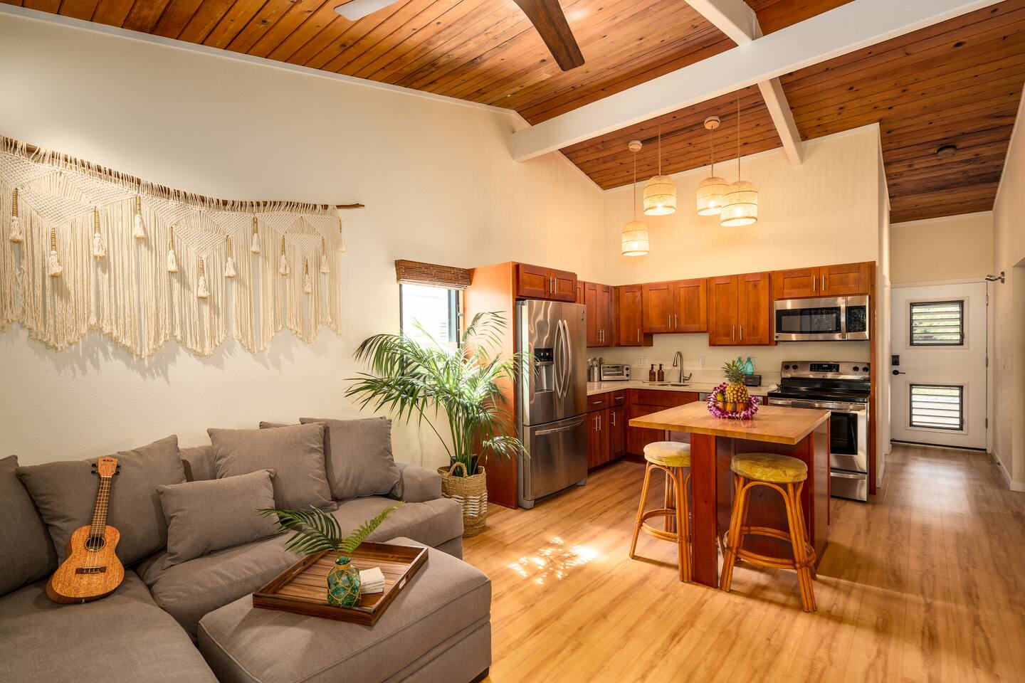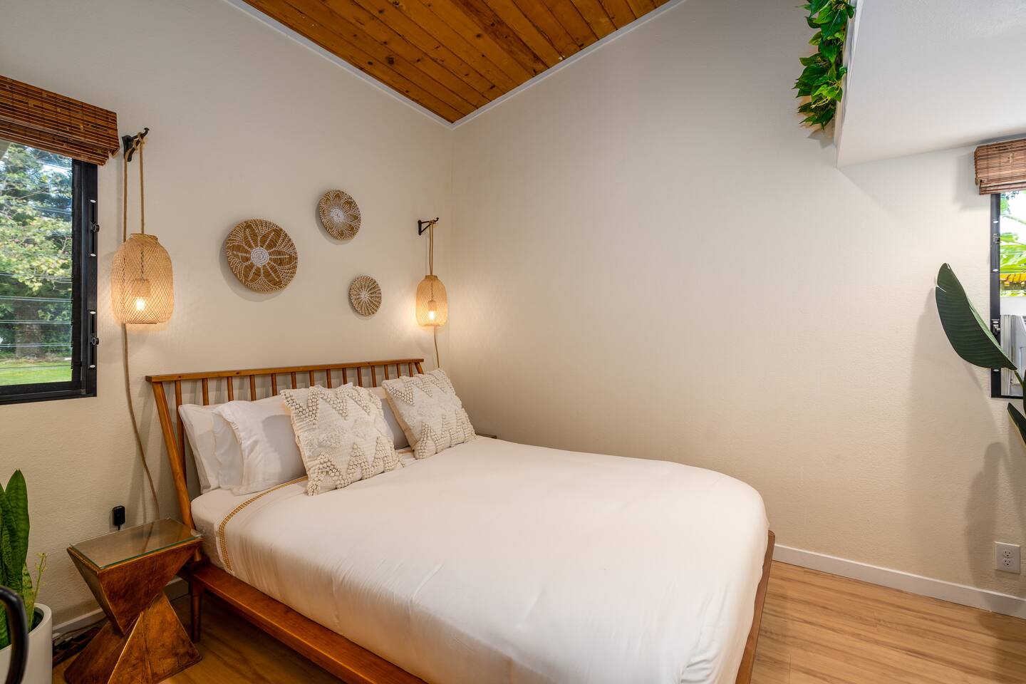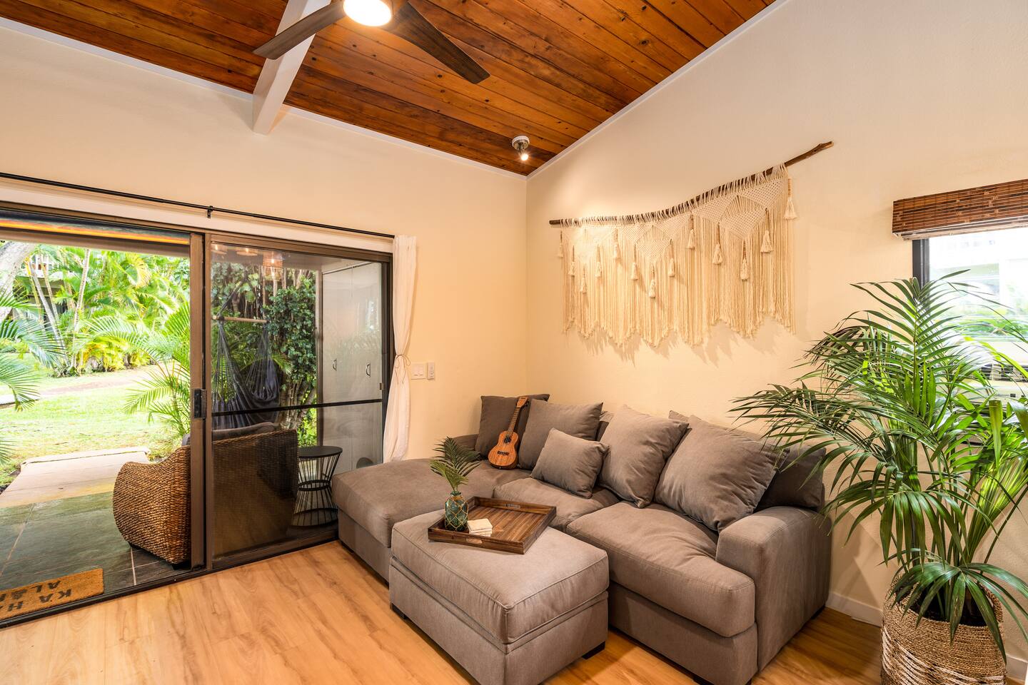 Wake up to the sounds of the palms dancing in the wind, tropical birds singing and waves crashing. Enjoy your complimentary morning coffee or tea with the ocean breeze, monarch butterflies and sea turtles. All with stunning views of neighboring islands Moloka‘i and Lanai just steps from your front door. During fruit season, pick your own breakfast from the mango tree right off of your private lanai, or enjoy many of the other tropical fruits the fruit plantation has to offer. Walk to 2 local beaches and several restaurants. Take in the rainbows over the gardens and ocean. Experience the warm trade winds, sandy surf, breathtaking views and glittery stars at night. In the winter months watch whales and dolphins play from the oceanfront lounge. _______________________ Our love shack was designed to bring complete relaxation and bohemian aloha vibes for the dreamy vacation you deserve. As you arrive to the property, you’ll have reserved 1 car parking right next to the house, perfectly situated underneath the apple banana trees for a tropical welcome! Upon entering you'll find soaring high ceilings throughout the property. The great room is perfect for entertaining with a fully equipped kitchen, island seating and open layout that flows to the oversized cloud-style couch. Pair your phone or laptop to the sound bar and enjoy music all day. We also have a 55” 4k HD Smart TV equipped with complimentary Netflix and cable, perfect for enjoying a movie after a long day at the beach. Seamless indoor/outdoor living— the great room opens up to the sunny and private lanai covered in lush tropical landscaping. Features include a large dining table, guest amenities closet, towel hooks, lounge chair as well as a swinging hammock chair. The perfect sanctuary to read, meditate, entertain, dine, catch up on some work or do some yoga. The main bedroom provides a king sized nectar memory foam mattress, situated under an oversized mandala headboard hand carved in Thailand. Lush jungle views from both windows, handmade furniture, and plenty of closet space. The second bedroom features a queen tempur-pedic. Peek-a-boo ocean views and the perfect desk space to work from home in style with views of the banana trees. The bathroom features a private shower finished with grounding stone and an oversized, therapeutic rainfall shower head and wand. You can also find storage in the vanity as well as a washer and dryer in bathroom closet. We provide all of these extra touches to make your stay as comfortable as possible: - We only provide organic sensitive skin products (EO & Puracy only!) - Free Wifi - Black out bamboo shades in every bedroom - A/C in each room - Smart G home assistant in the kitchen - Fruit picker - 2 surf boards - 2 boogie boards - 4 beach chairs - Cooler bag - Beach umbrella - 2 tennis rackets & balls - 1 basketball - Ukulele - 3 luggage racks - Cooling bamboo comforters - Extra sheets - Extra beach towels - Extra bath towels - Steamer - Q tips - Makeup remover wipes - Local fruit - Hawaiian coffee - Yogi Tea - Emergency flashlight, lanterns & extra batteries - Basic cleaning necessities - USB ports next to every night stand - Light dimmers in bedrooms, living room & kitchen - Mid stay cleaning available upon request for additional fee _______________________ We would be very happy if you leave us a review after your stay. It helps us provide the best guest experience possible, especially if you describe how you spent your time and what you explored in the area :) _______________________ *All photos taken on or a short distance from the bungalow*